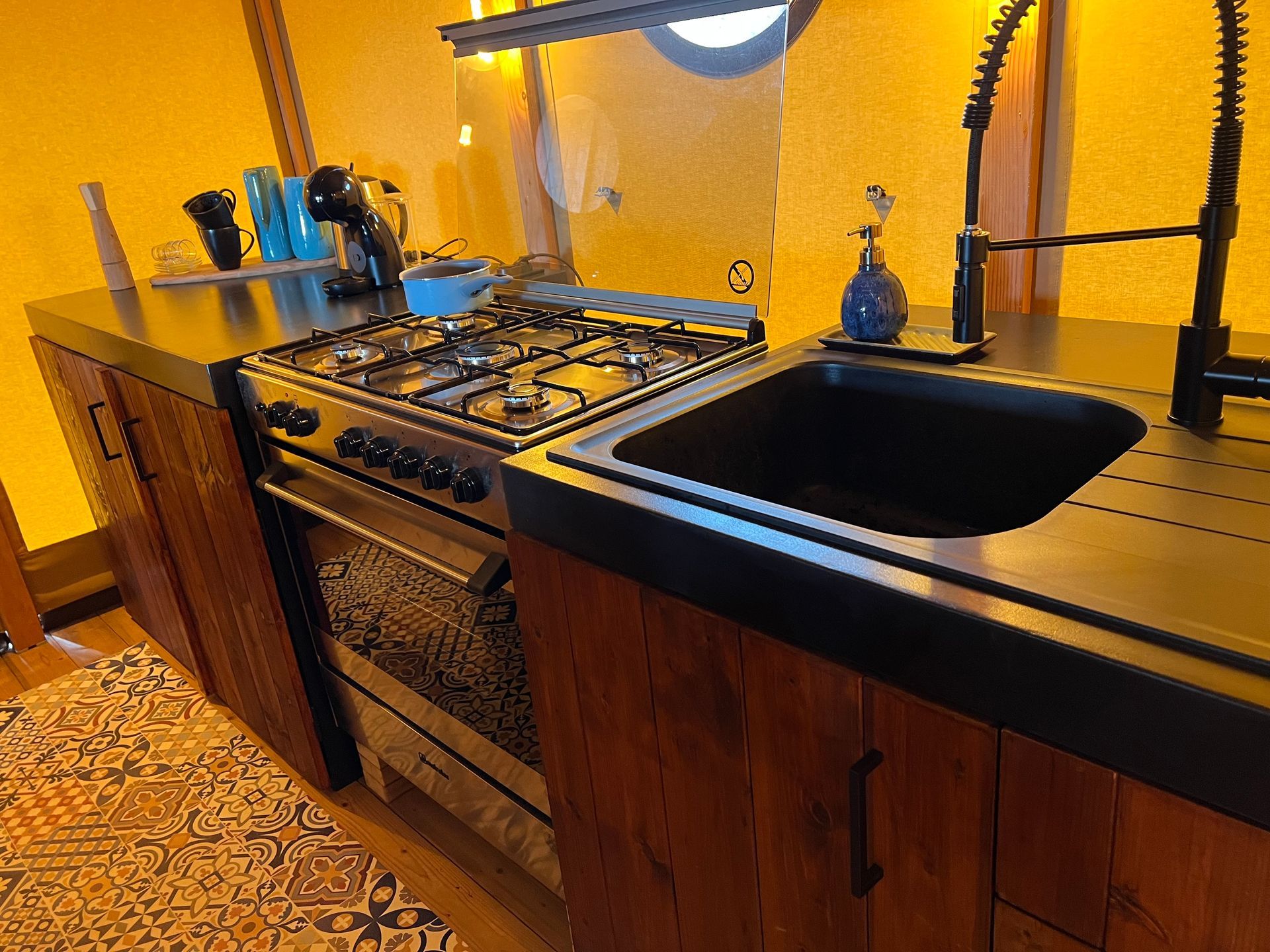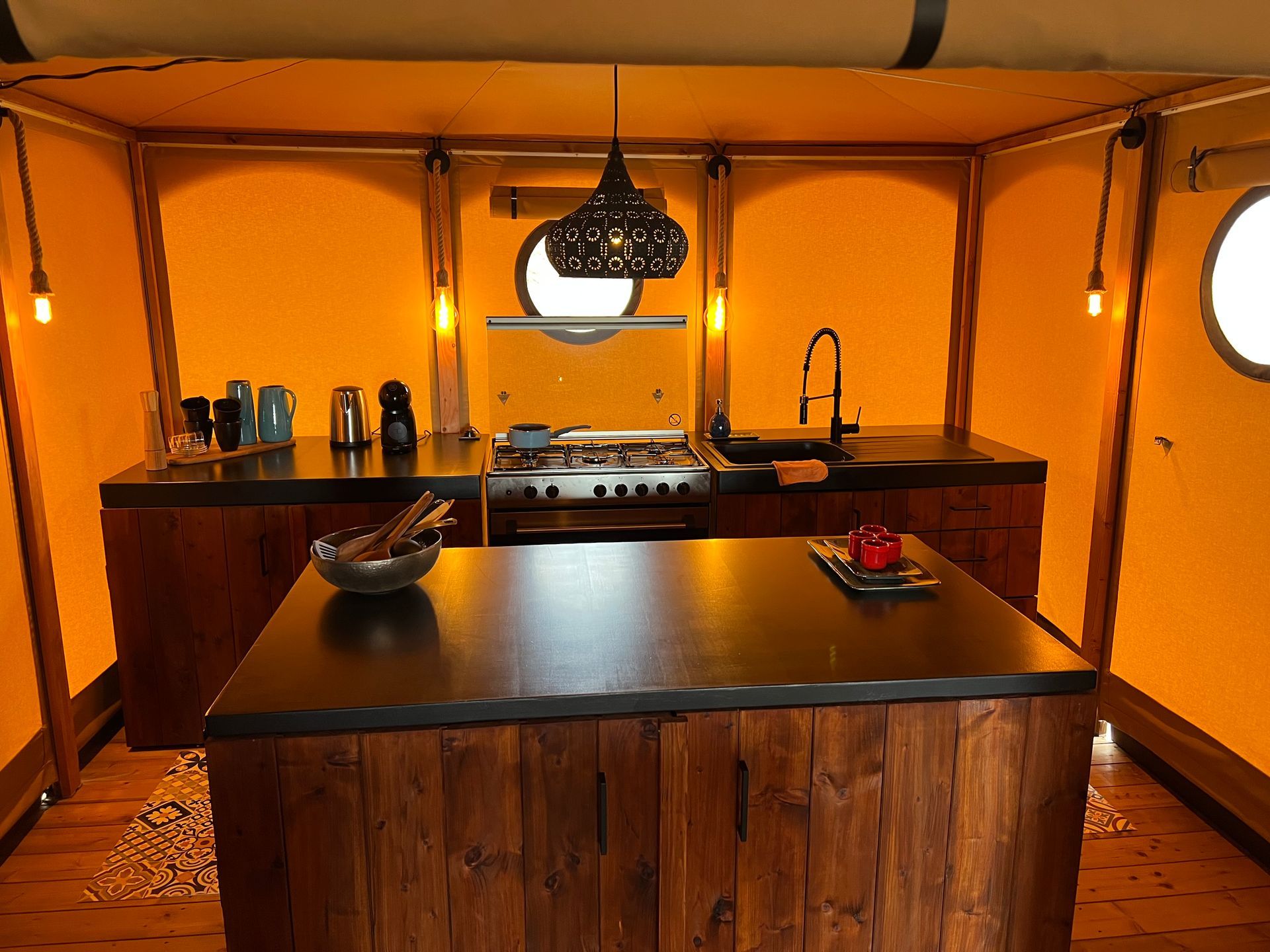 An fully equipped open kitchen with coffee machine, dishwasher, washing machine, refrigerator, stove and oven